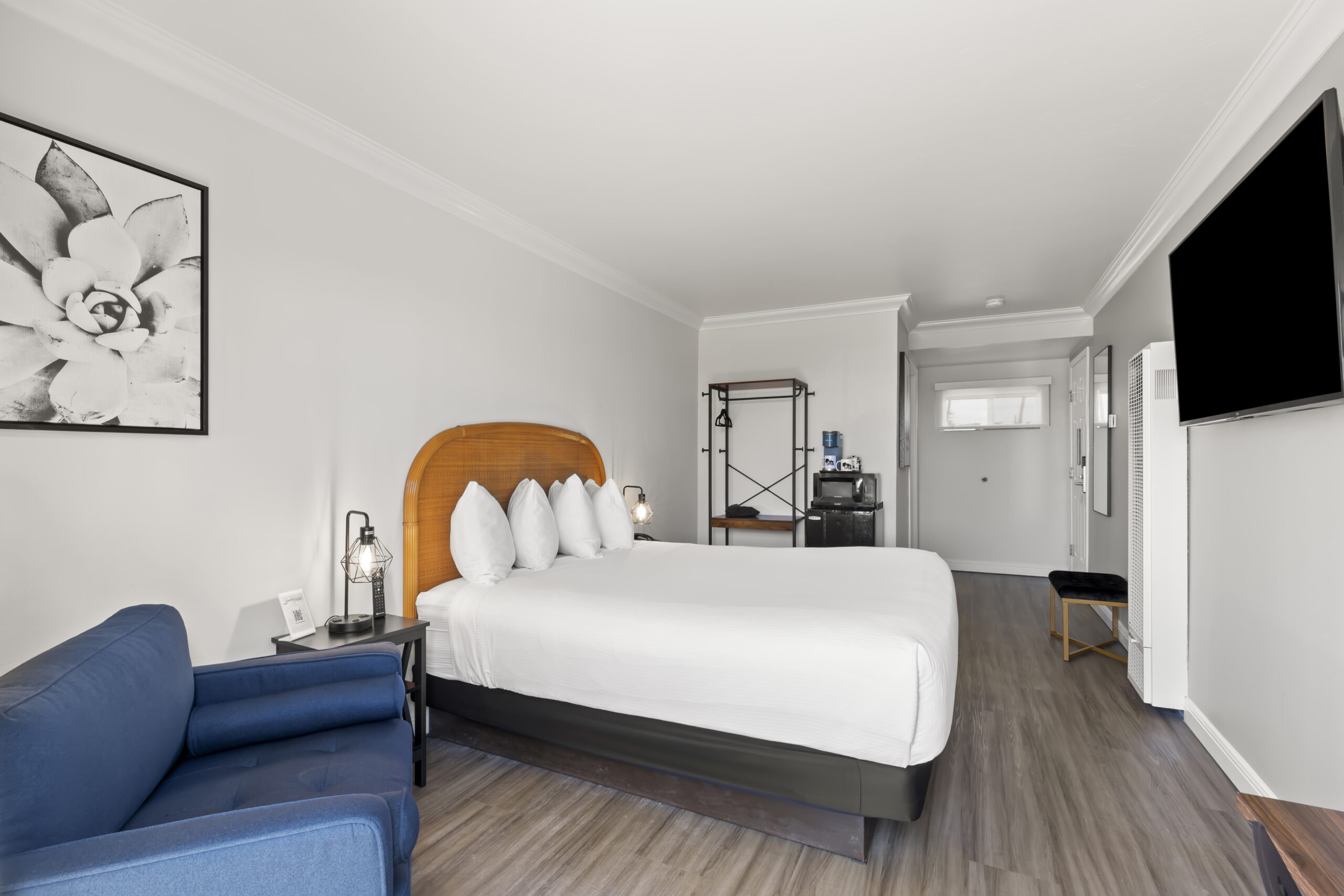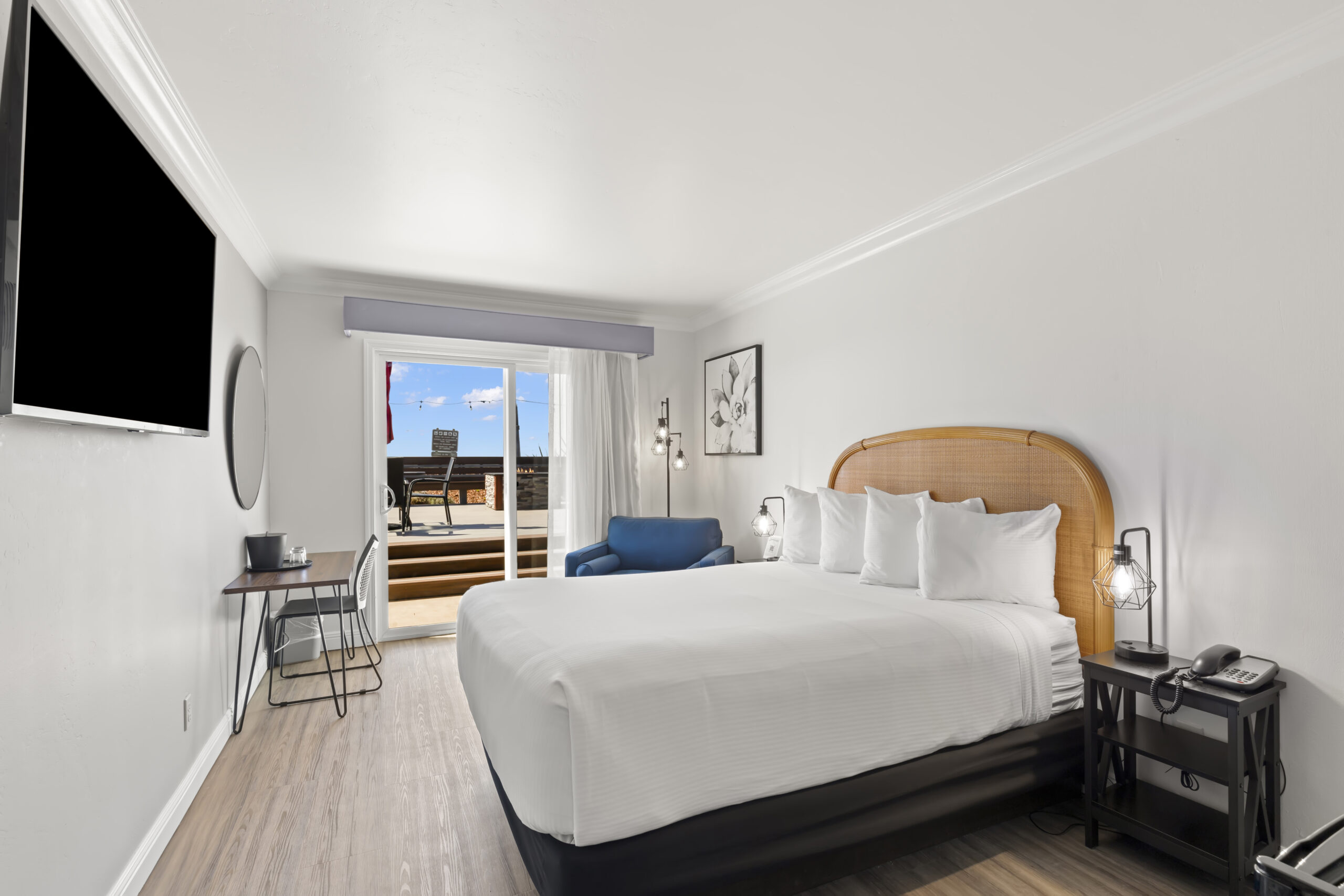 Welcome to the Beachcomber Motel's "Beachcomber Queen with View" room, where coastal charm meets modern comfort for an unforgettable stay in Fort Bragg, California. Enjoy breathtaking views of the serene ocean or picturesque surroundings from your room that leads out to our communal deck area where we have fire pits and barbeque grills for our guests to enjoy. Sink into the plush Queen-sized bed, outfitted with premium linens, and indulge in modern amenities including a flat-screen TV, complimentary Wi-Fi, and a mini-refrigerator. With our prime location near Glass Beach, the Beachcomber Queen with View room offers the ultimate coastal getaway experience. Book now for a memorable stay on the coast.