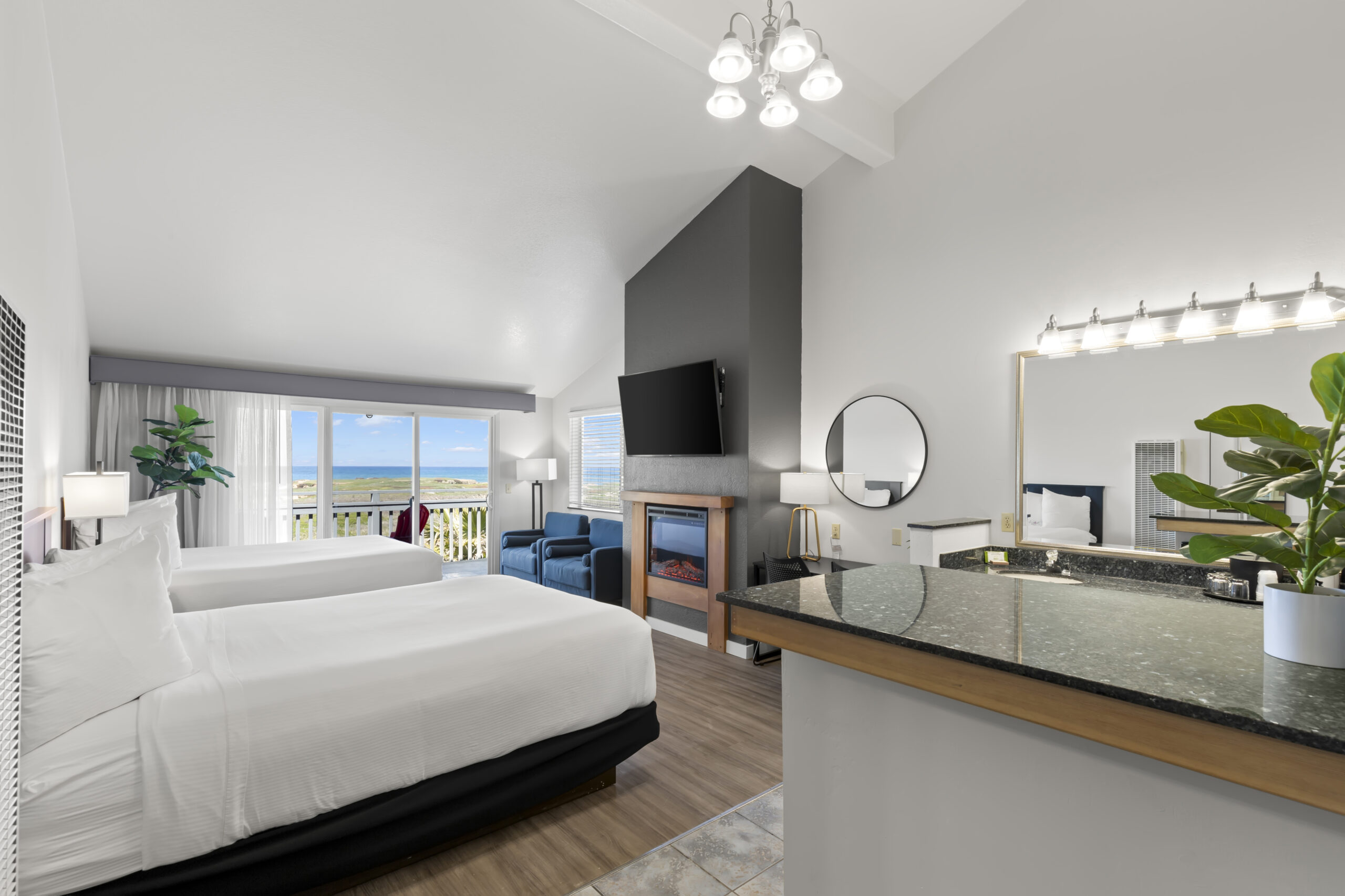 - The Beachcomber Motel’s Three Queen Suite with fireplace is a coastal haven designed for travelers seeking spacious comfort and relaxation. This charming suite boasts a serene coastal-inspired decor, featuring three luxurious queen-sized beds adorned with crisp linens and plush pillows, ensuring a restful night's sleep for you and your companions. The bright and airy space invites you to unwind in style, with a cozy seating area perfect for lounging and enjoying the company of loved ones. Stay connected with complimentary high-speed Wi-Fi and catch up on your favorite shows on the flat-screen TV. The suite also includes a microwave, mini-fridge, and coffee maker. Step outside onto your balcony and soak in breathtaking views of the Pacific Ocean, or take a leisurely stroll to the nearby beach just moments away. The Beachcomber Motel’s Three Queen Suite offers the perfect blend of comfort, convenience, and coastal charm for an unforgettable seaside escape. Book your stay today and experience the beauty of the California coast at The Beachcomber Motel.